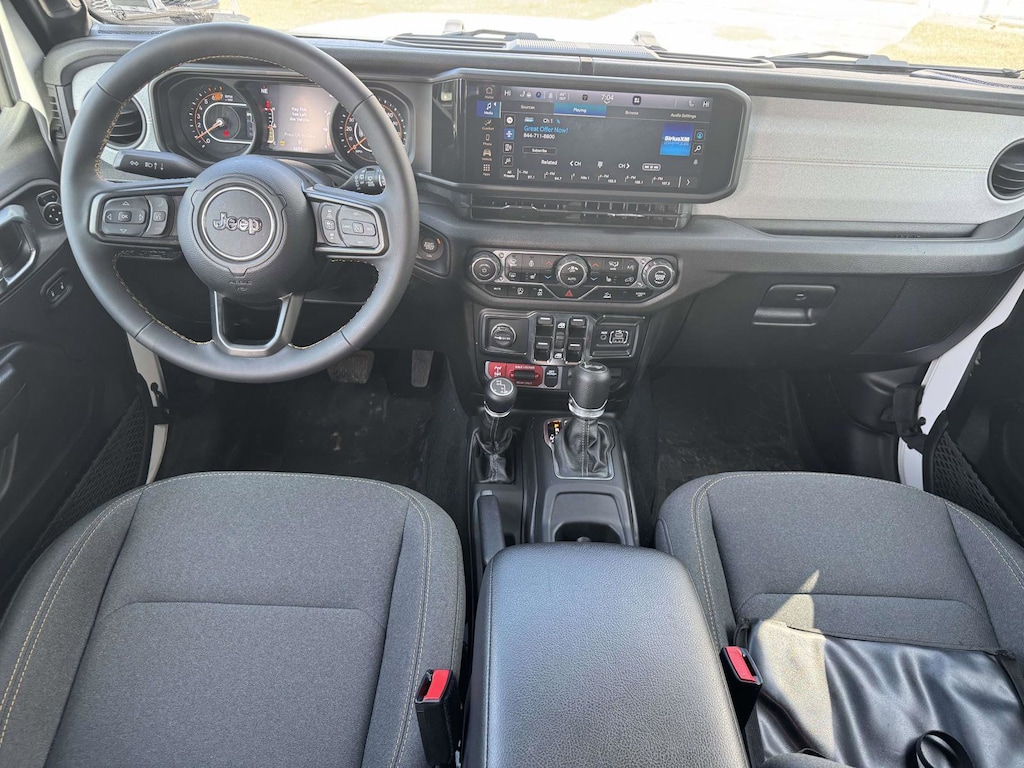 Technology meets durability in all the right ways. A Uconnect 5 system with a 12.3-inch multimedia display brings Apple CarPlay and Android Auto to the center of your drive, backed by an Alpine premium audio system. The 7-inch color driver cluster keeps key info clear, and steering wheel media controls let you adjust audio and calls without distraction. Convenience features include remote keyless entry, remote start, universal garage door opener, speed-sensitive power locks, front one-touch-down windows, and a premium-wrapped heated steering wheel. Safety technology adds confidence with ParkView Rear Back-Up Camera, Full-Speed Forward Collision Warning Plus, Enhanced Adaptive Cruise Control, Advanced Brake Assist, LED premium reflector headlamps with LED daytime running accents, and front LED fog lamps. Rugged details like Corning Gorilla Glass, rock protection sill rails, molded-in-color highline flares, and the Willys package with black grille and decals reinforce trail-ready toughness. Off-road hardware features Dana M210 wide HD front and Dana M220 wide rear axles, an electronic locking rear differential, Off-Road Plus Mode, Normal Duty and Willys suspension tuning, and available 17-inch black wheels, plus a Class II receiver hitch with 7- and 4-pin wiring for light towing and gear hauling. Auxiliary switches and a stop-start dual battery system add practical versatility, & more.